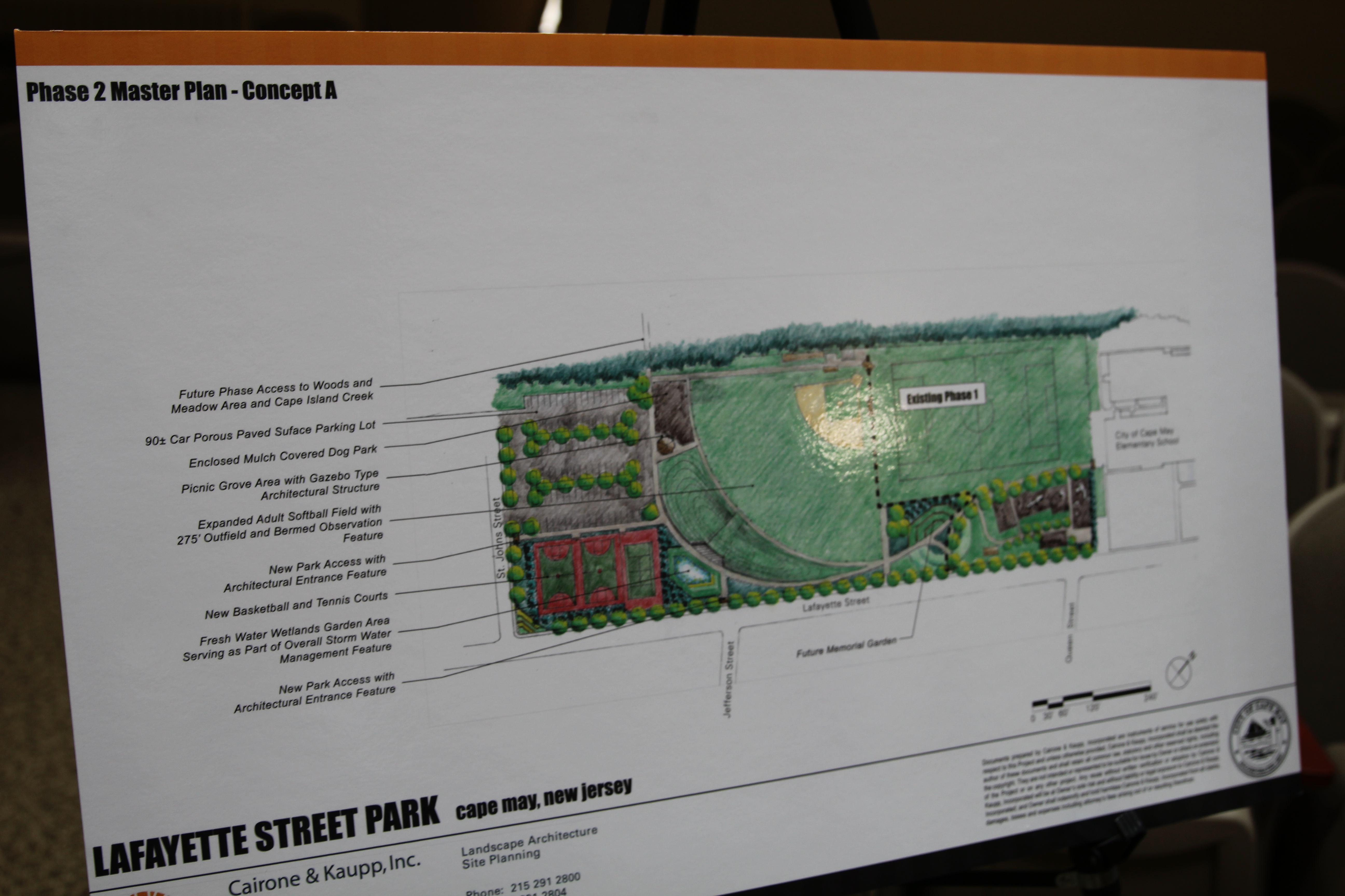 The initial meeting of the revamped Lafayette Street park planning committee was held Thursday afternoon at Cape May city council chambers. Deputy Mayor Shaine Meier and Council Woman Bea Pessagno chaired the committee introducing plans for the next phases of the park’s concept.